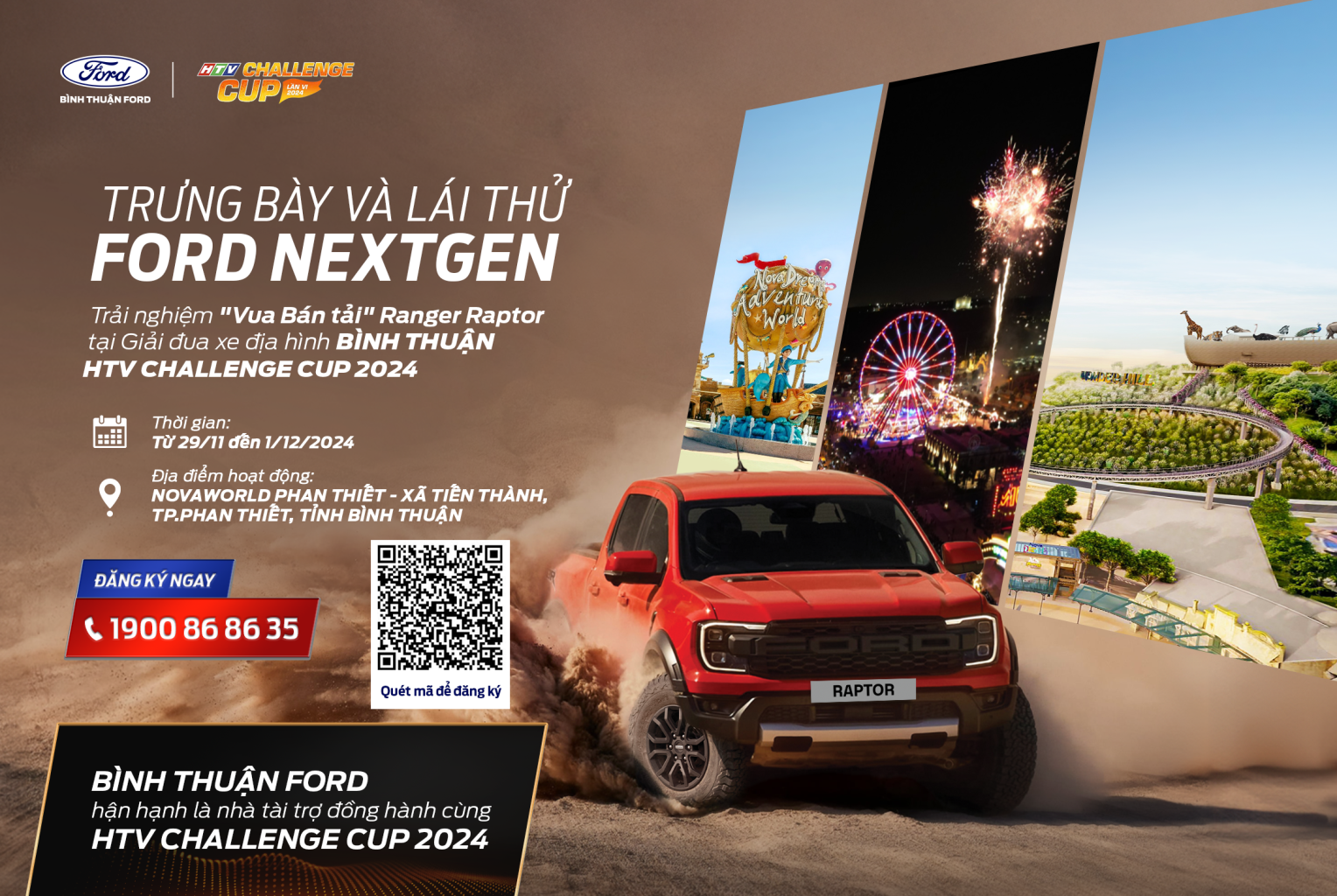 Sự kiện sẽ diễn ra xuyên suốt trong 3 ngày 29/11, 30/11, 01/12 tại Novaworld Phan Thiết. NovaWorld là khu đô thị biển lớn nhất tại Phan Thiết, vị trí tọa lạc đắc địa tại mặt tiền Đường Lạc Long Quân, xã Tiến Thành, Phan Thiết, Bình Thuận, Việt Nam, sở hữu quy mô rất lớn với tổng diện tích đất gần 1.000ha. Với cung đường chạy dọc bờ biển, những đồi cát đỏ thẳng tắp, các yếu tố này hứa hẹn mang đến cho người tham gia những trải nghiệm làm chủ sau tay lái tuyệt vời cùng chiếc xe Ford.