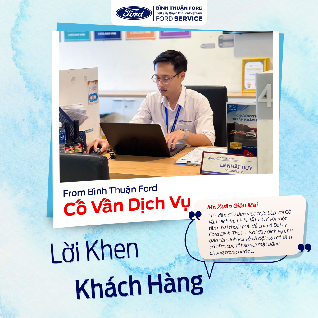 Với phương châm "Your Smile - Out Happiness" - Bình Thuận Ford không chỉ nỗ lực mang đến những chiếc xe Ford đẳng cấp xứng tầm với khách hàng, mà còn cam kết đồng hành xuyên suốt, đáp ứng mọi nhu cầu của với mỗi vị Chủ Sở Hữu trong suốt hành trình sử dụng, bảo trì, bảo dưỡng và nâng cấp trải nghiệm lái bằng hệ sinh thái 7S!