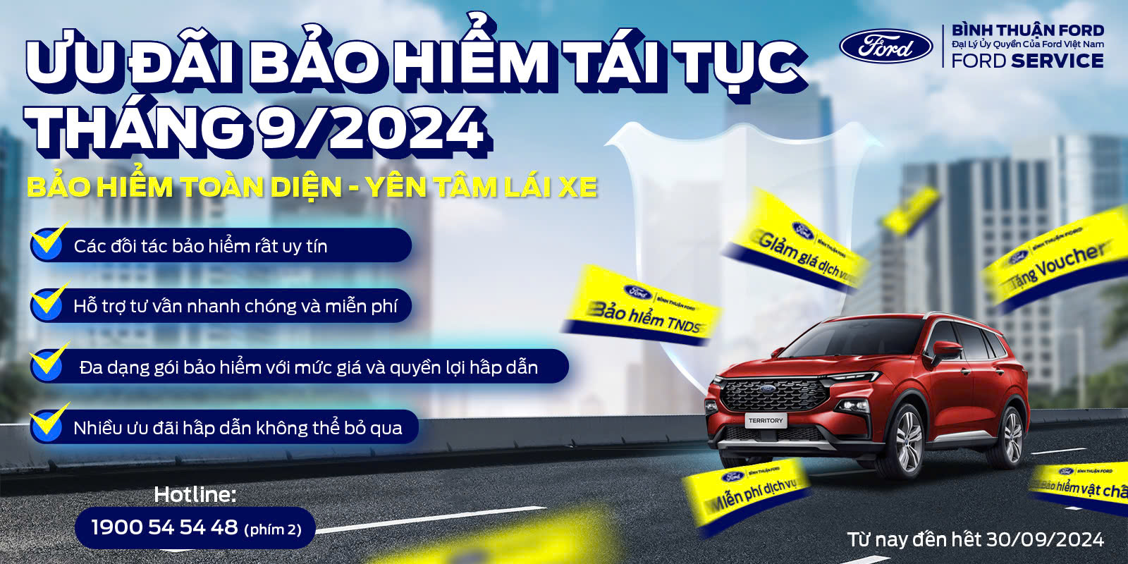 Với mong muốn mang lại giải pháp bảo vệ sự an toàn cho Quý khách hàng và chiếc xe của mình, Bình Thuận Ford triển khai chương trình “Bảo hiểm toàn diện - An tâm lái xe” trong tháng 09/2024.