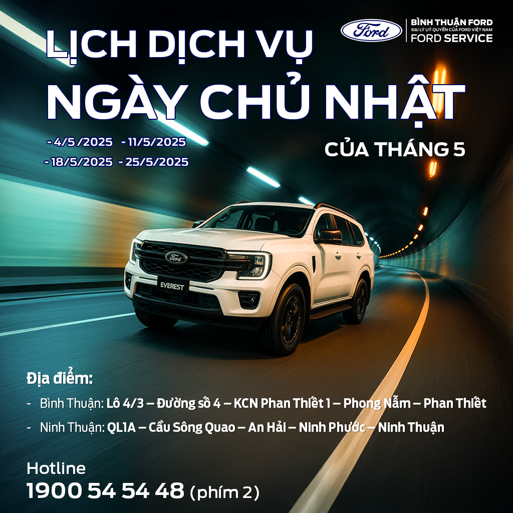 Bình Thuận Ford gửi đến Quý khách hàng lịch hoạt động các ngày chủ nhật trong tháng 5/2025 như sau.